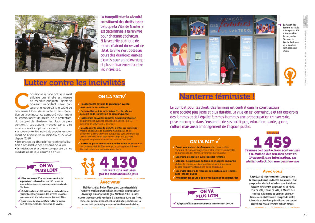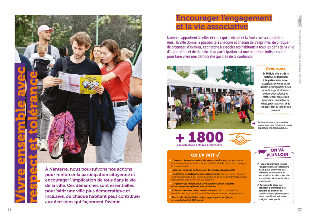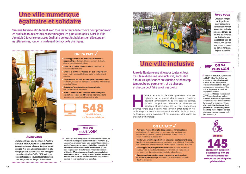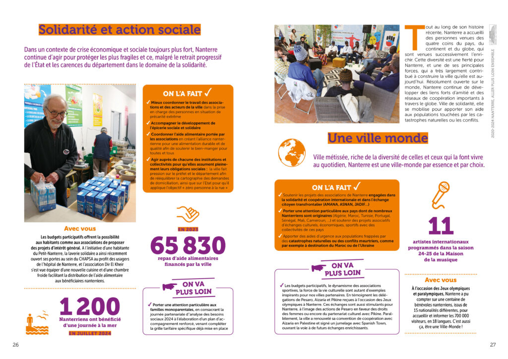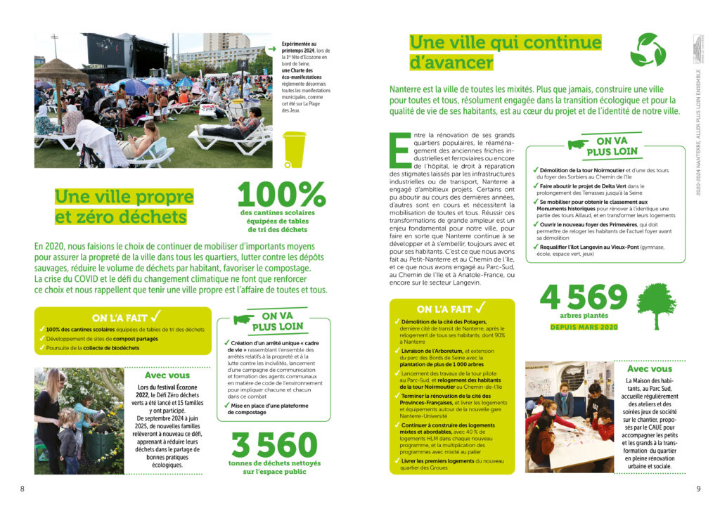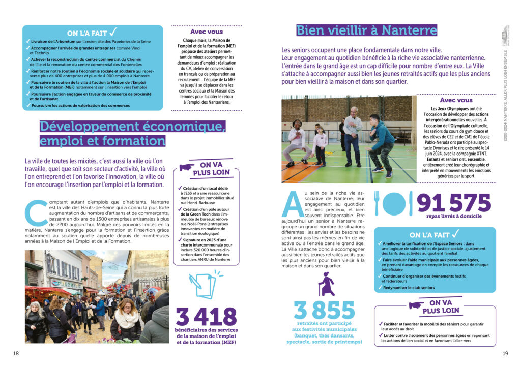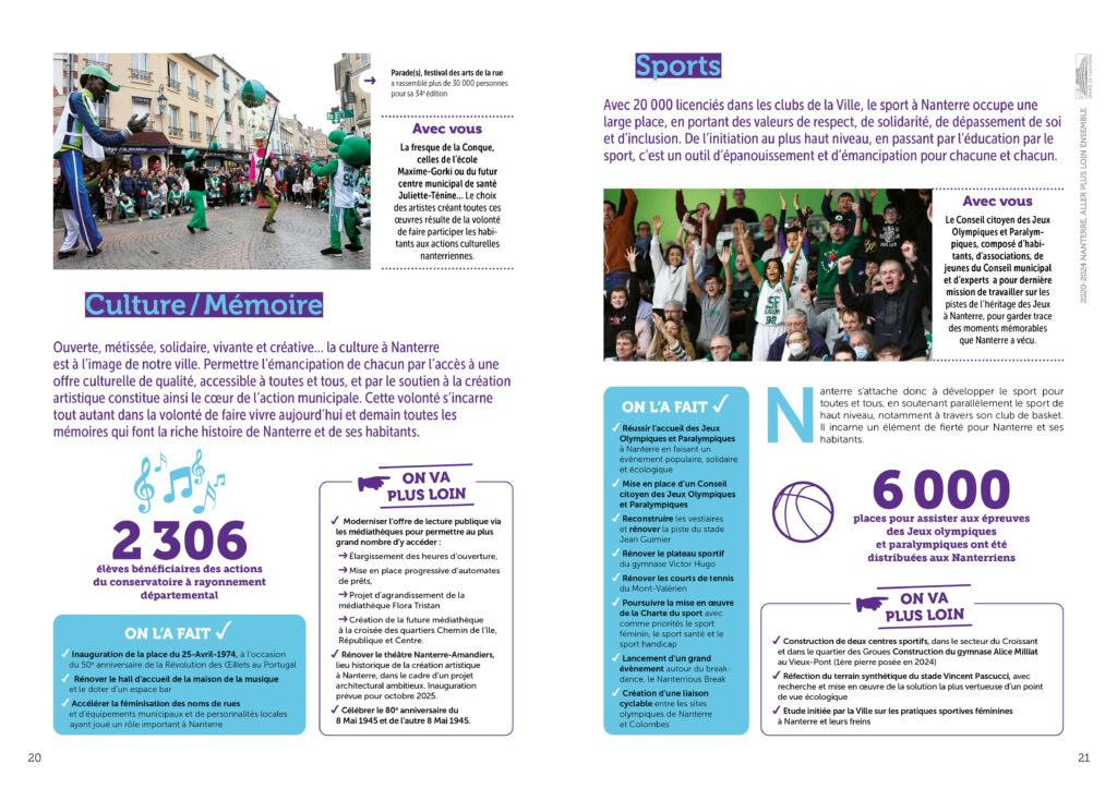 Conception réalisation et secrétariat de rédaction d’une plaquette bilan de l’équipe municipale de la ville de Nanterre à destination des habitant·es. 36 pages colorées et didactiques, animées de pictos et laissant la part belle aux photos. Remise des fichiers d’impression et PDF.