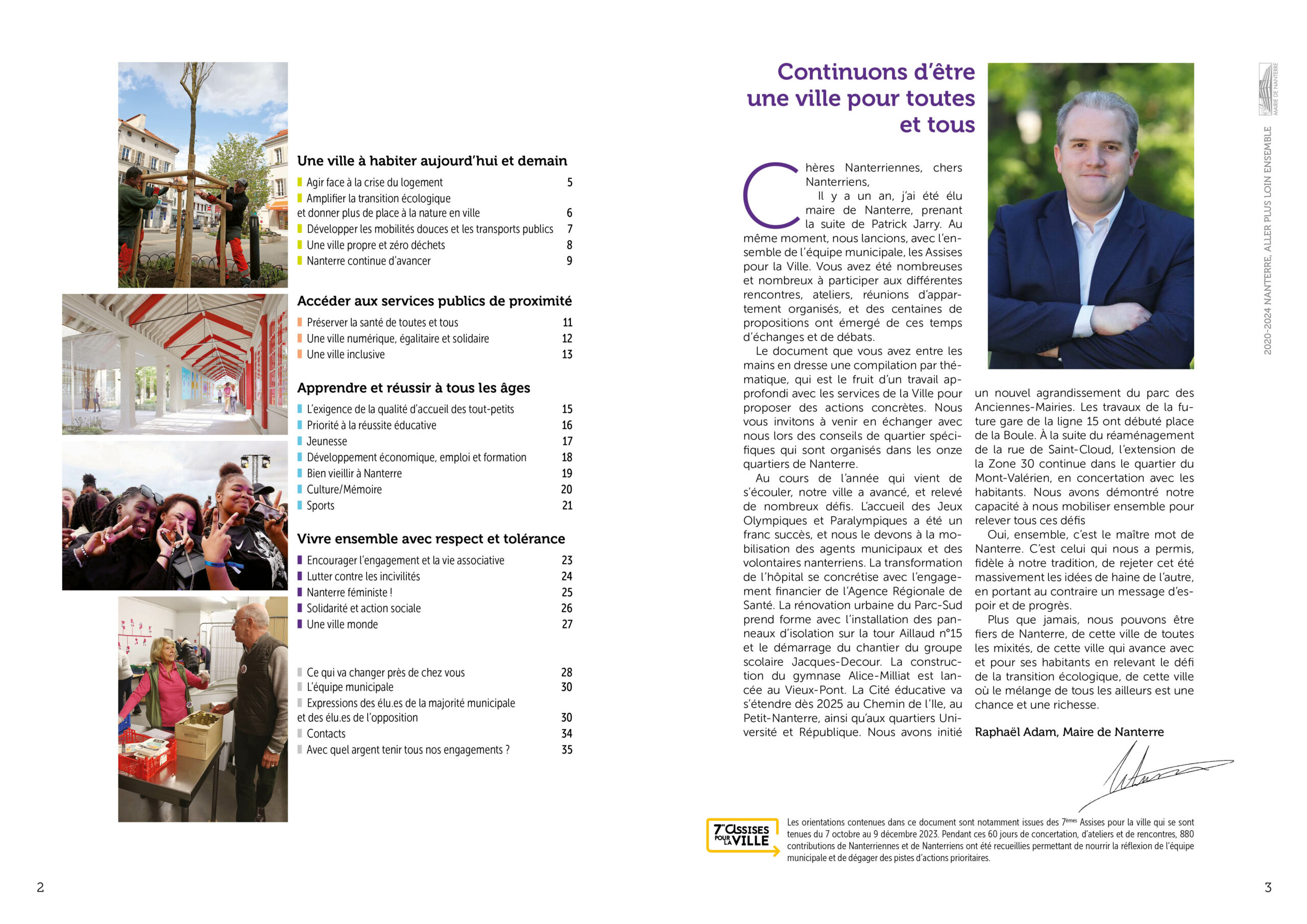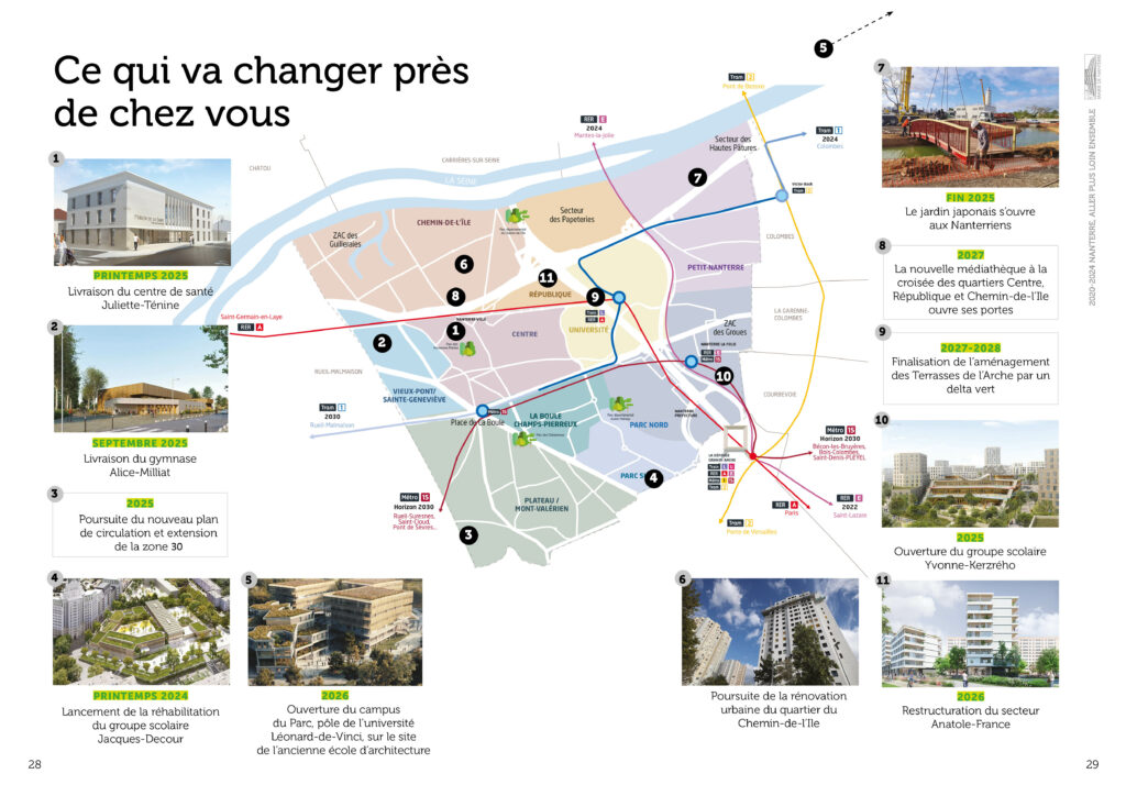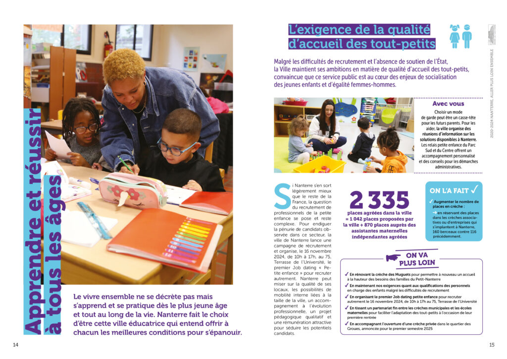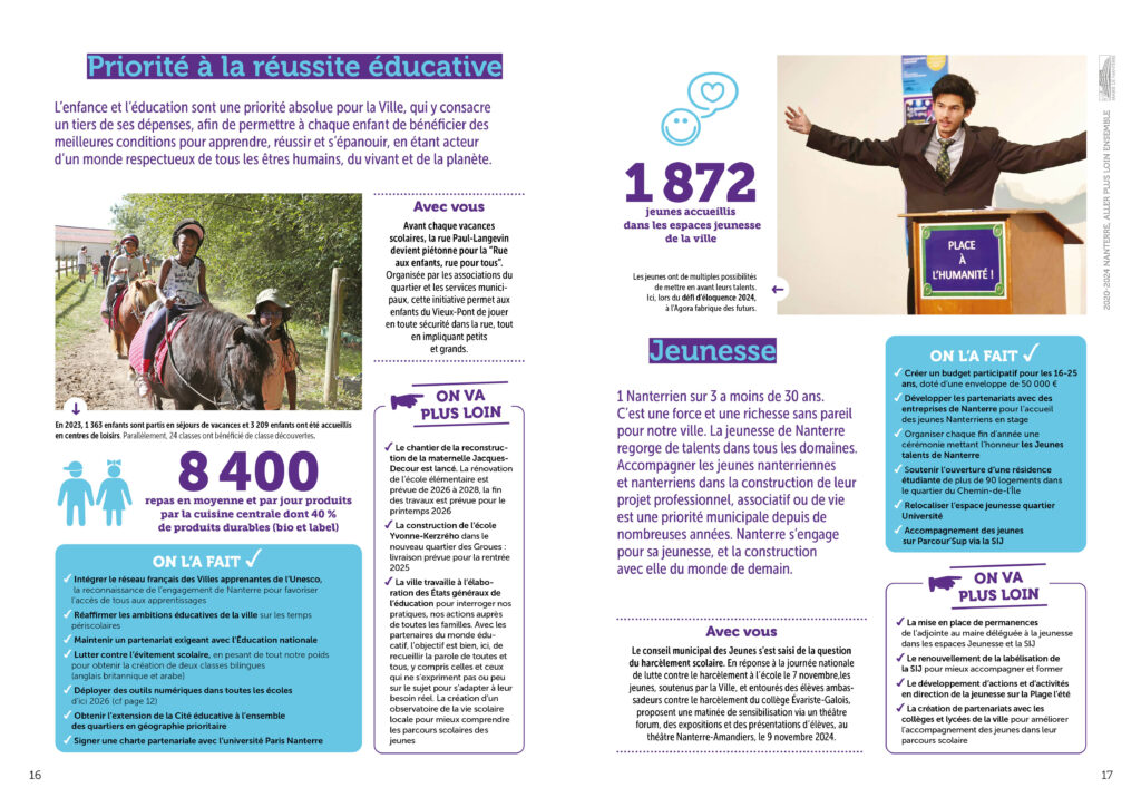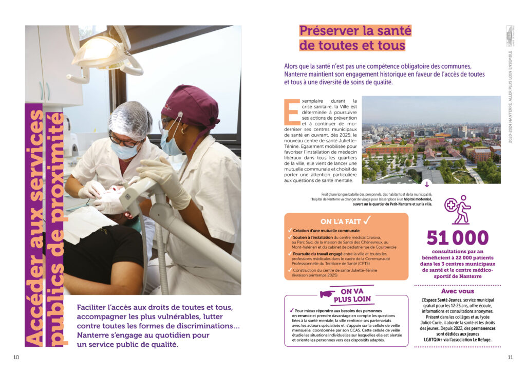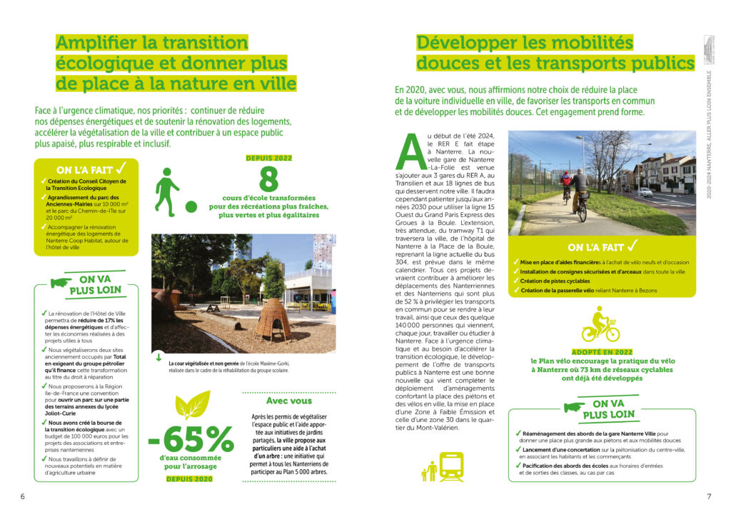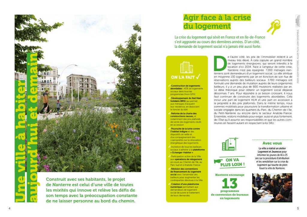 Conception réalisation et secrétariat de rédaction d’une plaquette bilan de l’équipe municipale de la ville de Nanterre à destination des habitant·es. 36 pages colorées et didactiques, animées de pictos et laissant la part belle aux photos. Remise des fichiers d’impression et PDF.